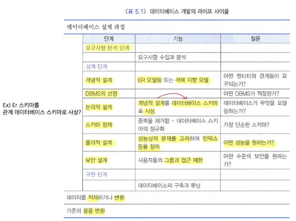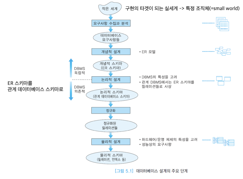 - 요구사항 분석, 개념적 설계, DBMS 선정, 논리적 설계, 스키마 정제, 물리적 설계와 튜닝 등 여러 작업들로 이루어짐