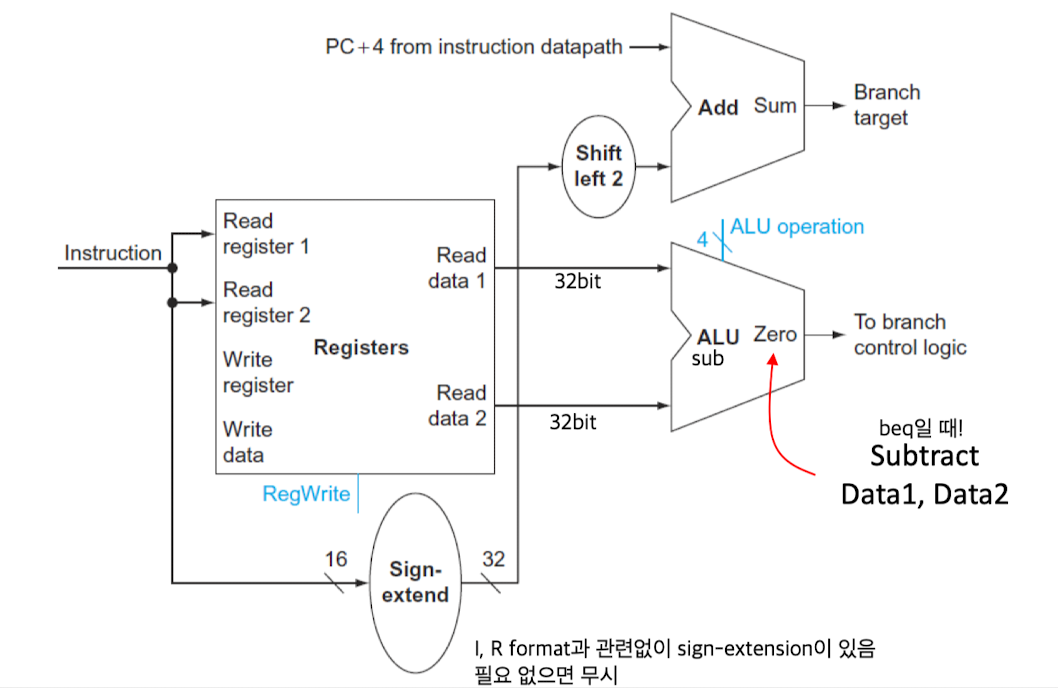 - Branch 변위: (PC + 4) + 320bits (16bits에서 sign extend된 상태) + sll 2-bits