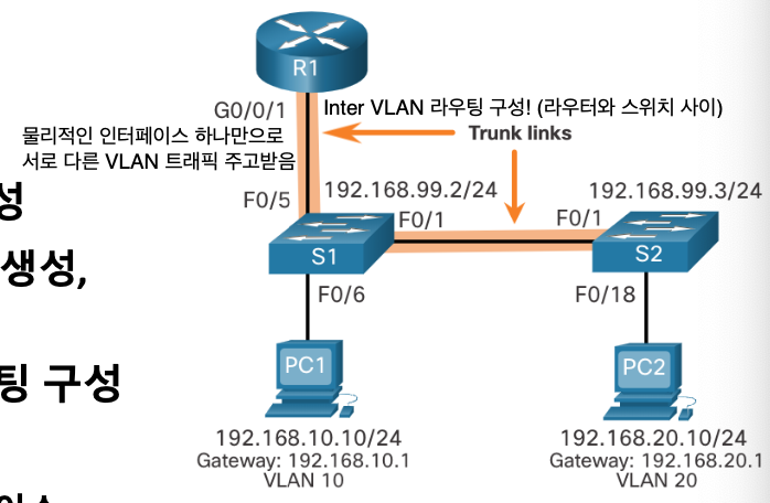 - 서로 다른 3개의 VLAN: VLAN 10, 20, 99