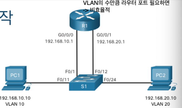 - 각각의 인터페이스 -> 서로 다른 VLAN의 스위치 포트에 연결