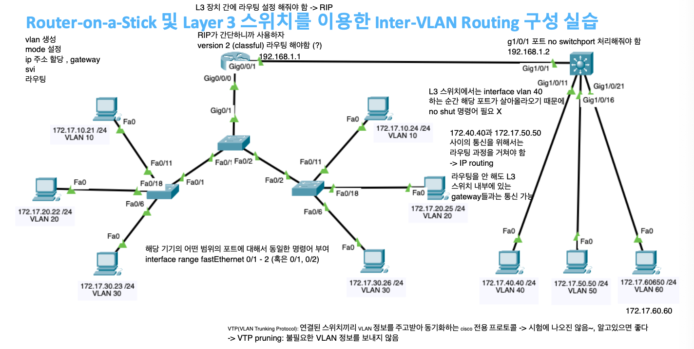 - 레거시 Inter-VLAN 라우팅은 스위치 네트워크에서 더 이상 구현 X -> 설명 목적으로만 사용