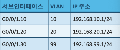 - 라우터 인터페이스 -> 서로 다른 VLAN을 정의하고 식별하는 서브 인터페이스로 구성