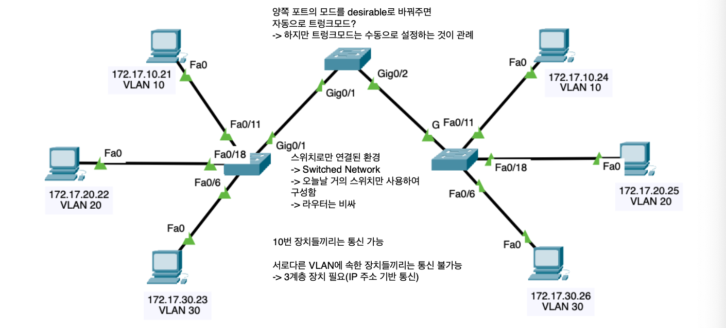 - switchport mode trunk 또는 switchport mode access 명령어를 이용하여 스위치를 트렁크 또는 액세스로 고정 설정하면 협상(negotiation)에 의한 이슈를 피할 수 있음