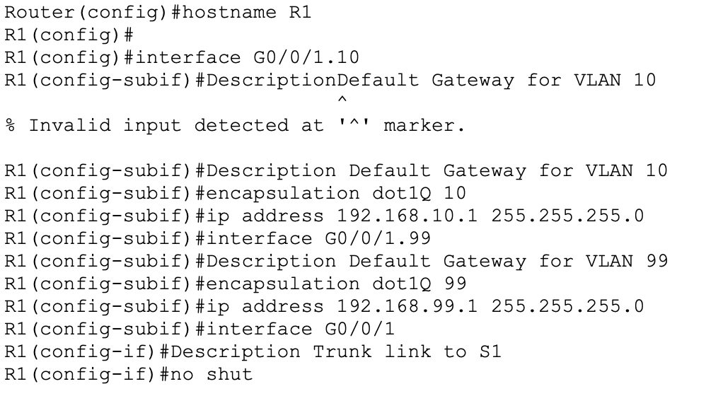 - S1 스위치 - R1 라우터: Inter-VLAN 라우팅 구성