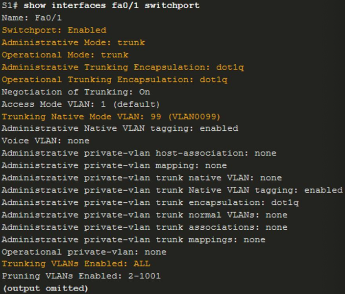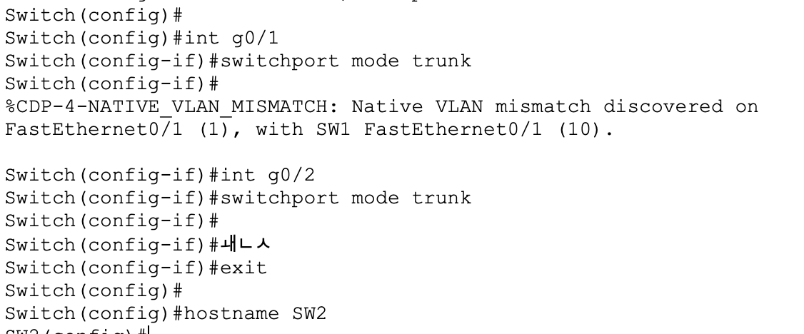 - 네이티브 VLAN을 VLAN 1이 아닌 다른 VLAN으로 설정: swithcport trunk native vlan vlan-id