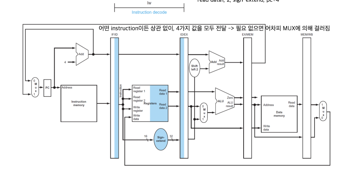 - IF/ID pipeline register에 기반하여, 3개의 값을 얻는다. -> sign-extend 32bits, 2개의 레지스터의 데이터