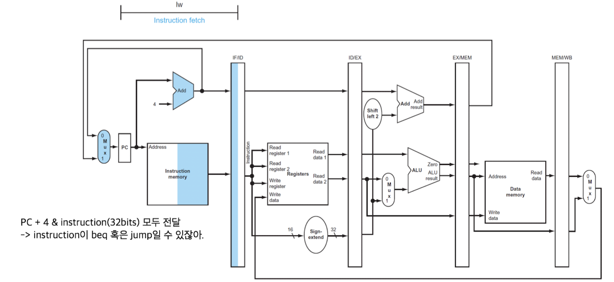 - 이렇게 더해진 주소는 IF/ID pipeline register에 저장된다. -> beq와 같은 나중 명령어를 위해