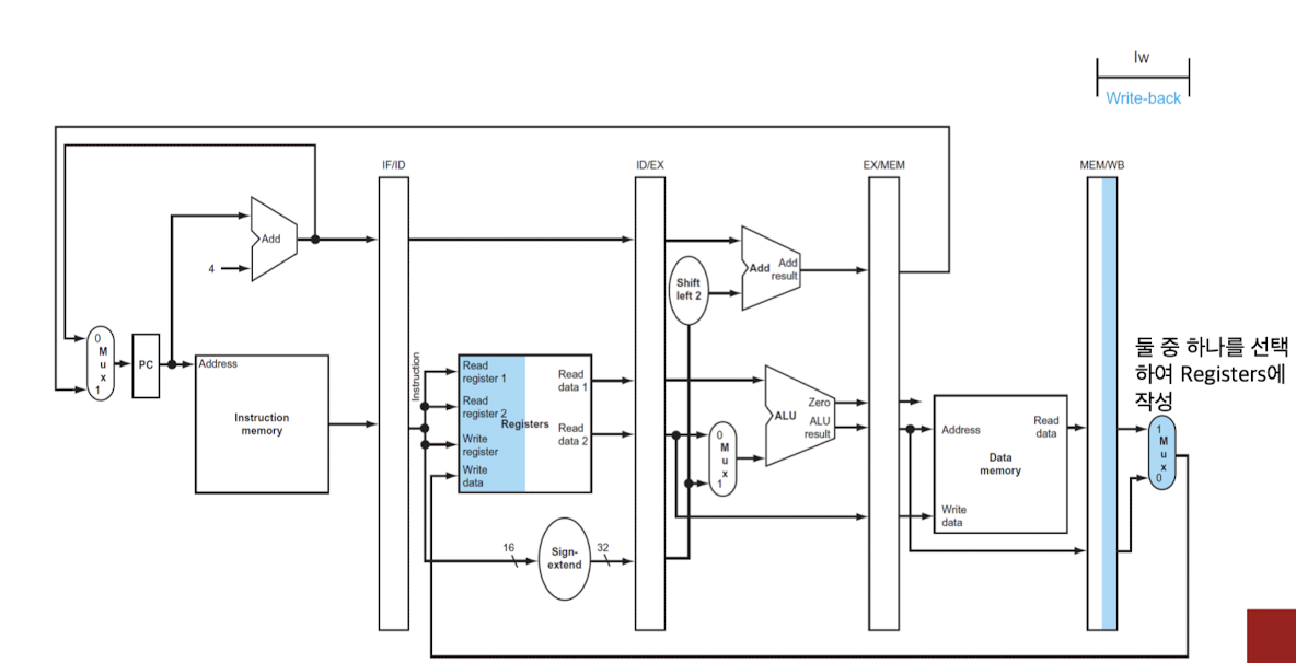 - MEM/WB pipeline register에서 데이터를 읽어들여서 -> 레지스터에 저장