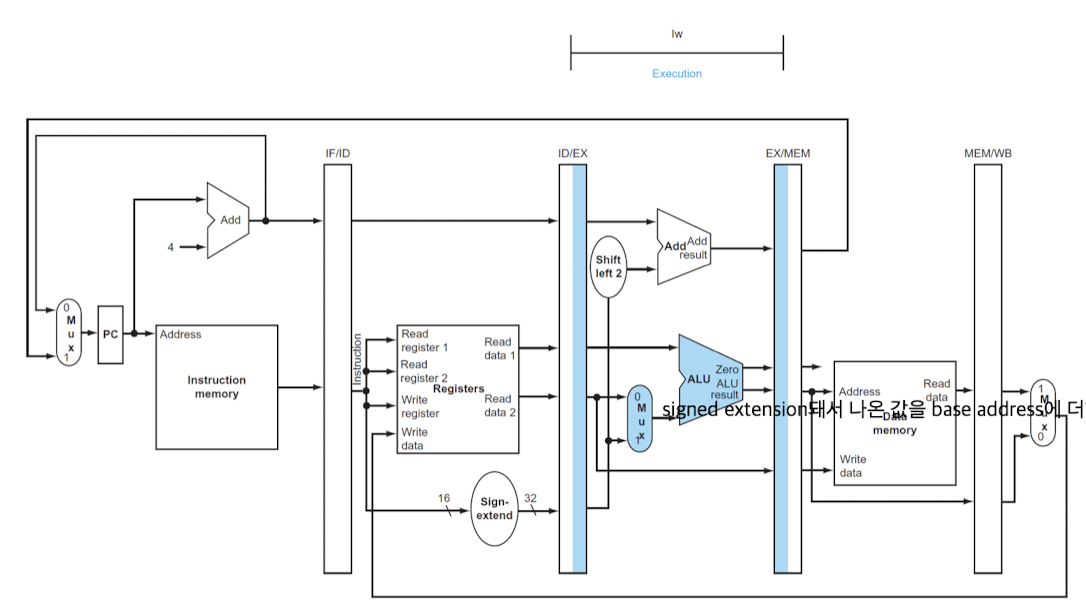 - IF/ID pipeline register에 기반하여, 3개의 값을 얻는다. -> sign-extend 32bits, 2개의 레지스터의 데이터
