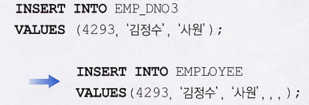 - 기본 릴레이션의 애트리뷰트들 중에 뷰에 포함되지 않은 애트리뷰트에 대해 NOT NULL이 지정된 경우