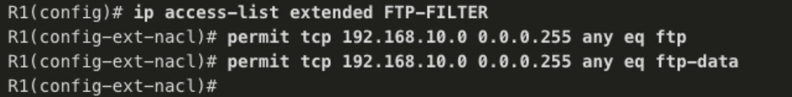 -> 확장 ACL: R1의 좌측 포트에 설정 -> 출발 주소 이외에도 세밀한 조건을 바탕으로 필터링 가능 -> 초반부 불필요한 트래픽을 차단할 수 있음