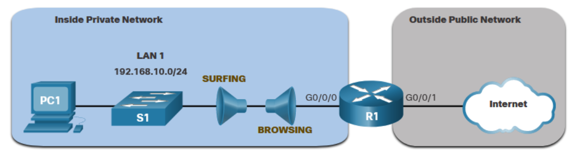 • BROWSING - R1 G0/0/0 인터페이스를 통해 내부 호스트로 돌아오는 웹 트래픽만 허용 -> 다른 모든 트래픽은 암묵적으로 거부