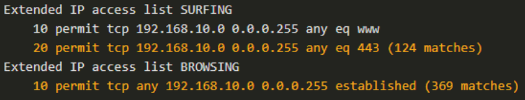 ip access-list extended SURFING Remark Permits inside HTTP and HTTPS traffic permit tcp 192.168.10.0 0.0.0.255 any eq 80 permit tcp 192.168.10.0 0.0.0.255 any eq 443 exit
