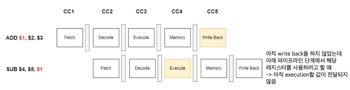 - 이전 명령어의 wb이 반영되기 이전에 다음 명령어(wb 반영될 예정인 레지스터 포함)의 exe가 실행되는 경우 발생