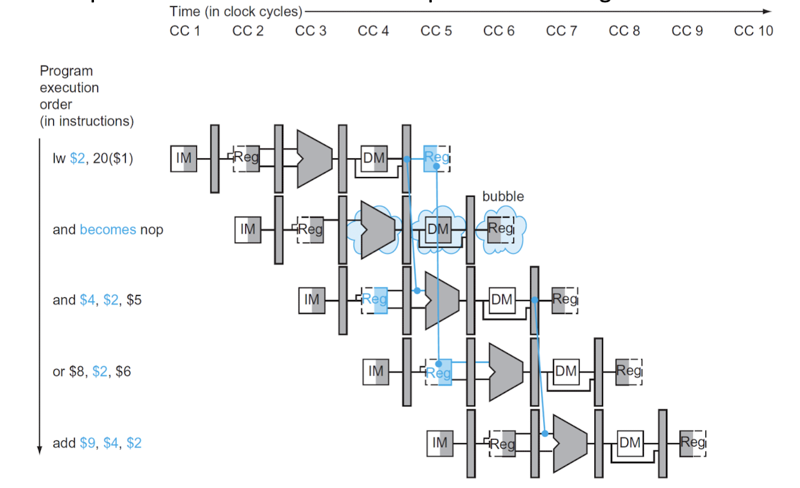 - lw 명령어의 $s0가 다음 명령어에서 사용될 때, 한 스테이지만큼 쉼으로써 문제를 해결한다.