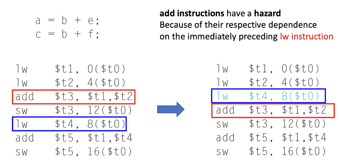 -> 좌측의 경우에는 $t2에 lw하는 명령어 바로 뒤의 add 연산이 $t2를 사용하기 때문에 한 번의 stall, $t4에 lw하는 명령어 바로 뒤의 add 연산이 $t4를 사용하기 때문에 또 한 번의 stall이 발생한다.