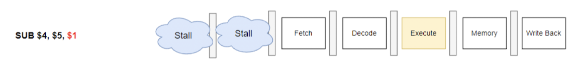 - pipeline 구조에서 r format의 rd값이 다음 명령어의 rs 혹은 rt에 위치할 때 문제가 발생