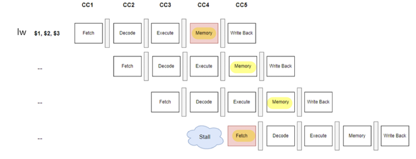 - 문제) 명령어와 데이터가 같은 메모리에 저장된 경우 -> fetch, memory 단계가 같은 clock cycle에 겹치면, 같은 메모리에 동시에 접근하여 충돌 발생