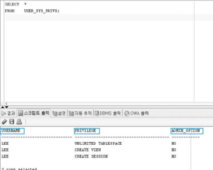 - USERNAME은 권한 허가받은 사용자, PRIVILEGE는 허가받은 시스템 권한, ADMIN_OPTION은 시스템 권한을 허가받은 사용자가 다른 사용자에게 허가 가능한지 여부