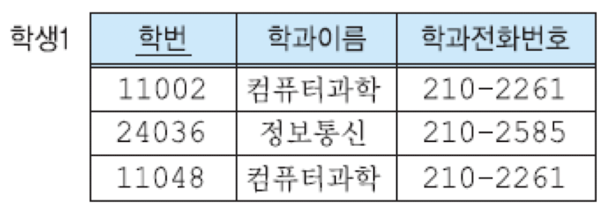 - 두 번째 튜플의 학과 이름을 인공지능으로 변경 -> 수정 이상 발생 -> 전화번호가 같은 학과는 모두 이름을 변경해줘야 데이터베이스 일관성 유지