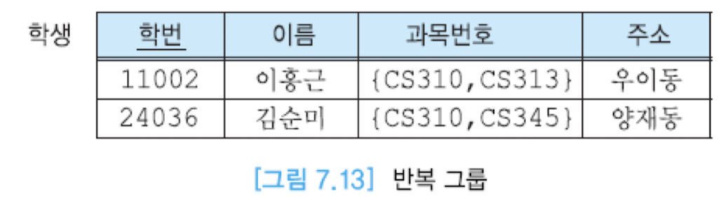 - 릴레이션의 모든 애트리뷰트에 반복 그룹(repeating group)이 나타나지 않으면 제 1정규형 만족