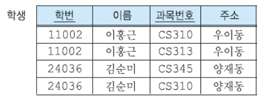 - 부주의한 데이터베이스 설계 -> 제어할 수 없는 데이터 중복 야기 -> 여러 가지 갱신 이상(update anomaly) 유발