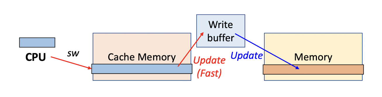 - cache memory에 sw가 적용되면, 해당 값을 write buffer로 전달 -> write buffer에 차곡차곡 쌓다가 일정 순간에 -> main memory로 업데이트
