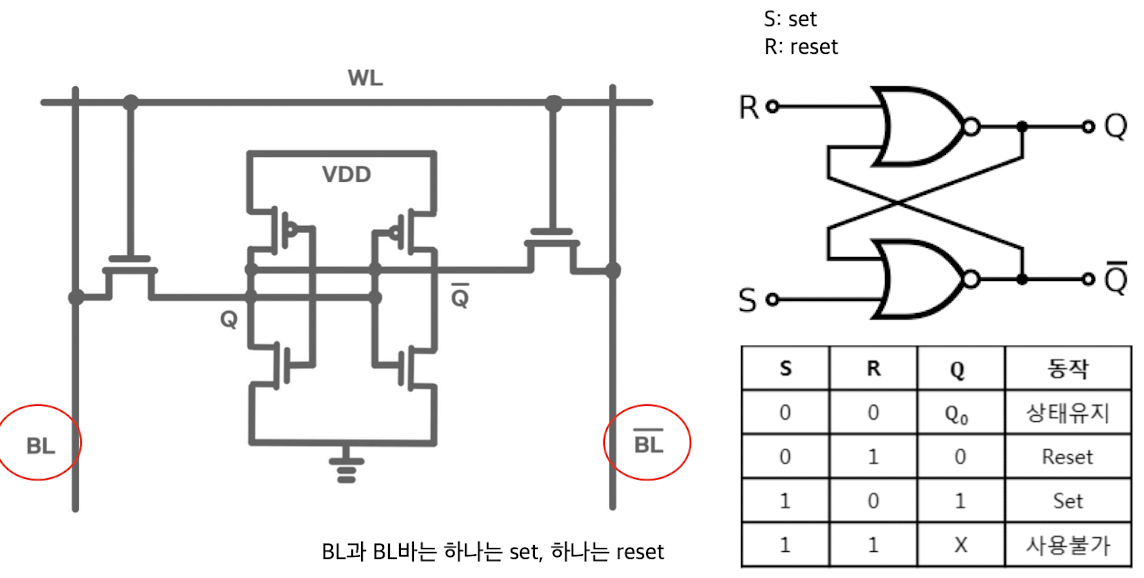 - 한 비트 표현을 위해 6개 이상의 트랜지스터 필요: DRAM에 비해 집적도가 낮고, 소비 전력이 큼