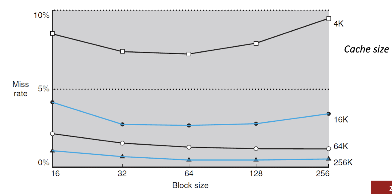 - 그러나, 일정 구간부터는 miss rates 증가 -> why? -> cache size가 고정이라는 것은 block size * Indexes가 서로 반비례 관계라는 것 -> block size가 커지면 Indexes가 감소 -> 다양한 block을 가져오지 못함