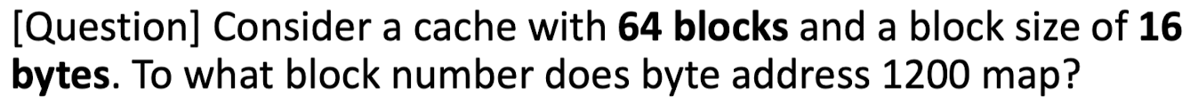 - Block address: Byte address / Btyes per block = 1200 / 16 = 75
