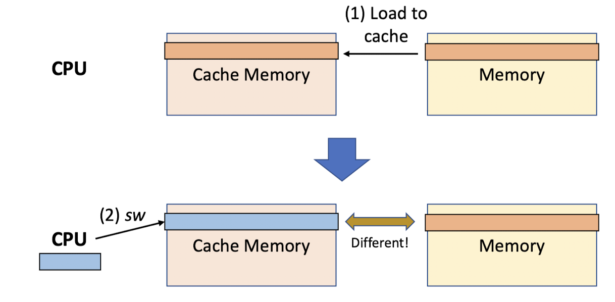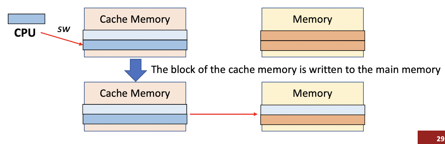 - sw를 수행했을 때, cache memory와 main memory 사이에 차이가 발생(inconsistent) -> cache memory의 바뀐 값을 memory로 옮겨야 한다.