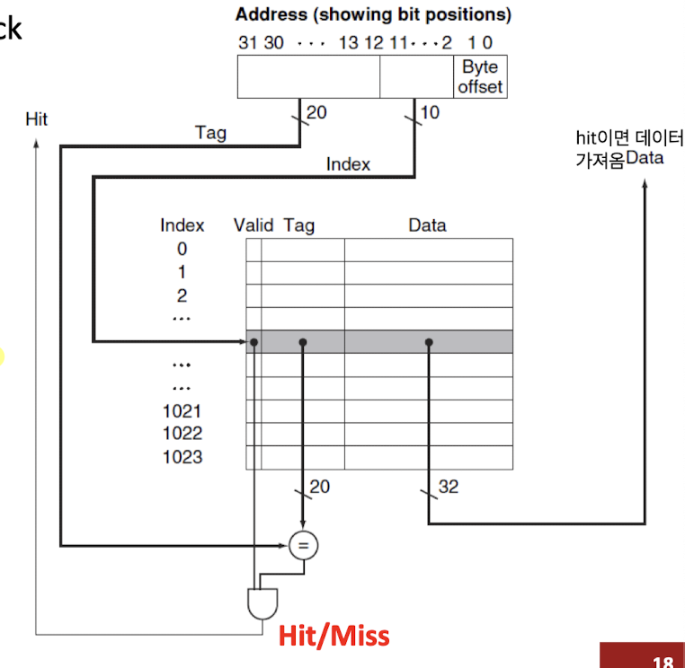 - 주소: Tag(32 - n - m - 2 bit) + Cache Size(n bit) + Block Offset(m bit) + Offset(2 bit)
