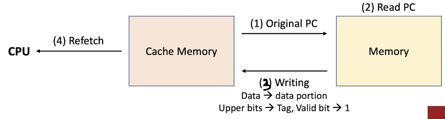 - Writing -> cache entry의 일부로 data를 cache memory에 putting -> tag field -> valid bit on