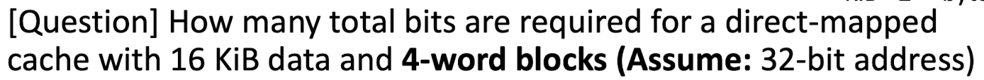 - Total cache size: block의 개수 * (block size + tag size + valid field size) = 2^10 * (2^4*2^3 + 18 + 1) = 2^10 * 147 = 147 KiBits -> 18.4 KiB