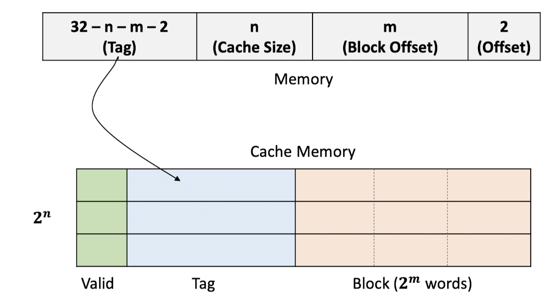 - 주소: Tag(32 - n - m - 2 bit) + Cache Size(n bit) + Block Offset(m bit) + Offset(2 bit)
