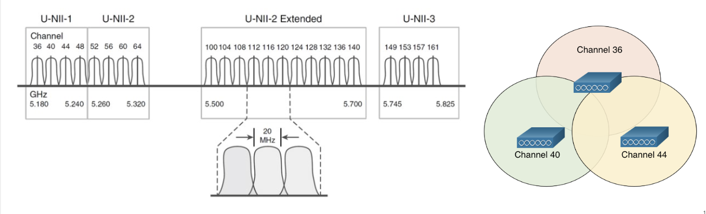 - 5GHz 802.11a/n/ac 표준 -> 5GHz 대역을 3개의 섹션으로 나누어 채널 정의, 다음 채널과 20MHz씩 분리