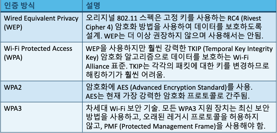 - WEP, WPA는 보안 취약으로 오늘날 권장 X