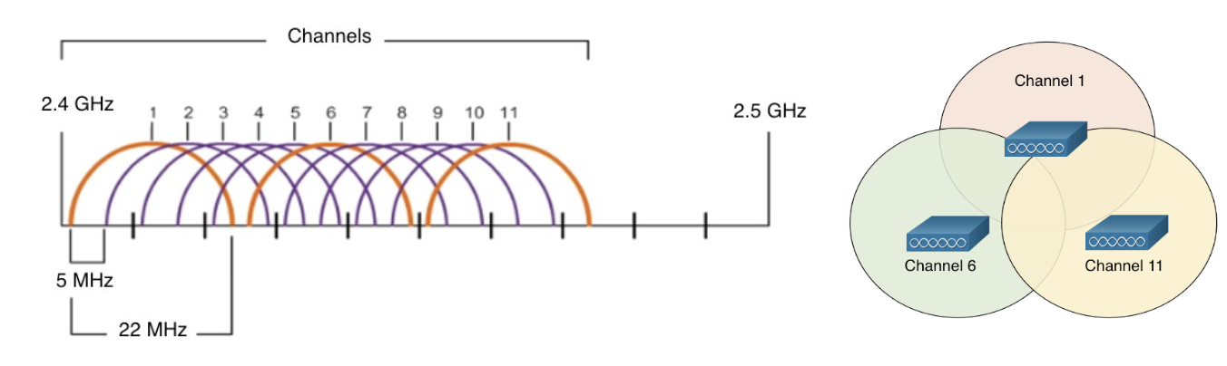 - 2.4GHz 밴드 -> 여러 개의 채널로 나뉨 -> 각 채널은 22MHz 대역폭 할당, 다음 채널과 5MHz씩 분리