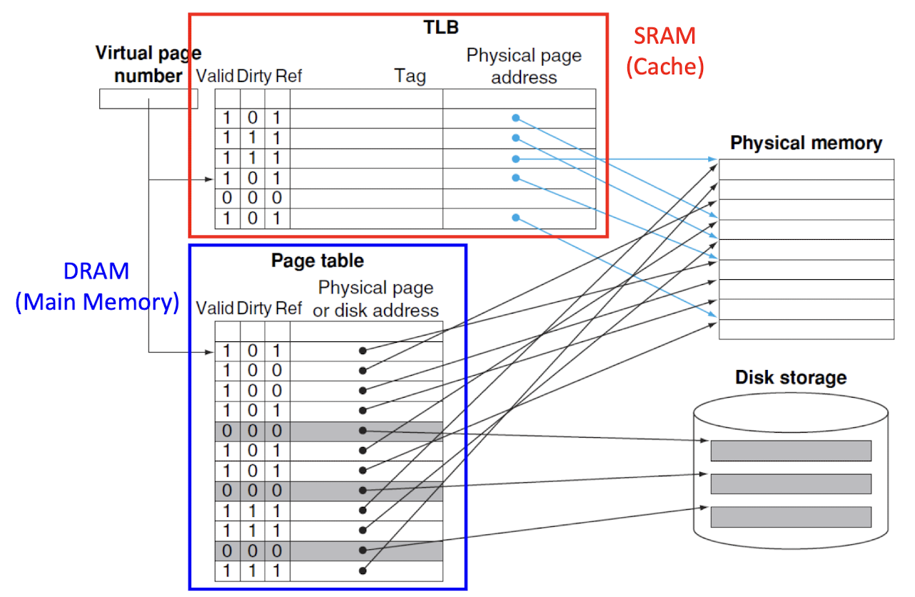 저장용량: TLB < Cache < Page Table(main memory로 생각) < Disk