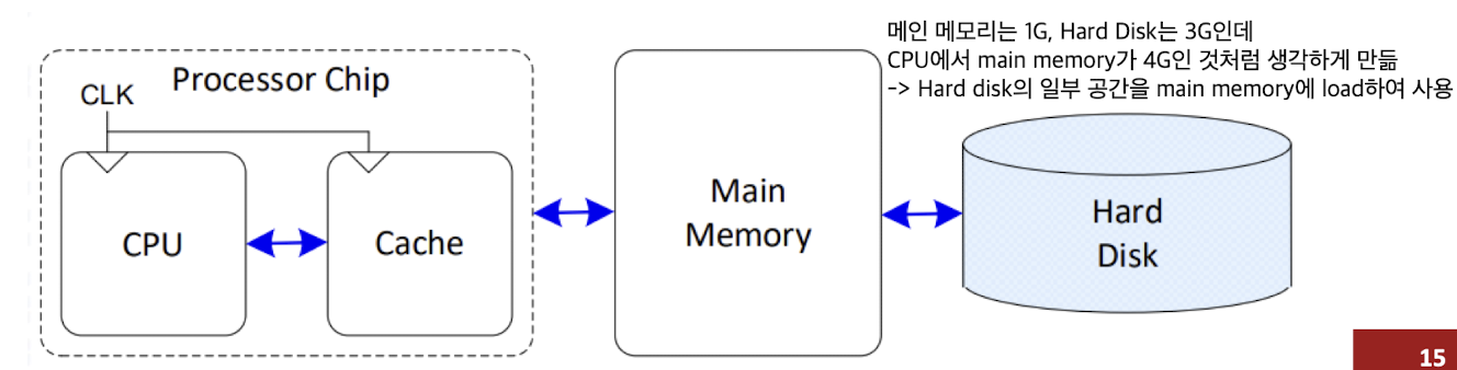- CPU에서 main memory에 모든 정보가 있다고 생각하게 만드는 기술(but, 추가적인 정보는 hard disk에) -> not memory (실제로 존재 X)