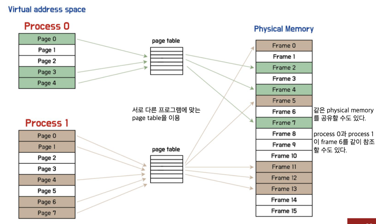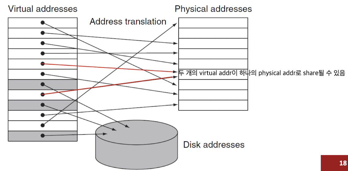 - 하나의 physical address는 두 개의 virtual addresses에 의해 공유될 수 있음 -> 2개의 프로그램이 같은 데이터를 공유