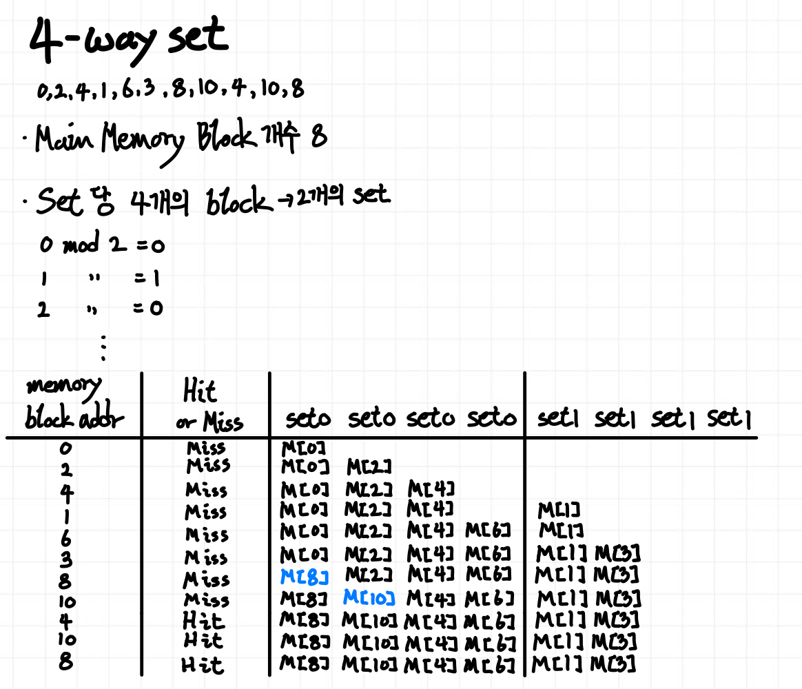 8 -> miss -> 0번 set에 Memory[8] 데이터 저장 -> 0번 set에는 2개의 block 정원이 가득 찬 상태