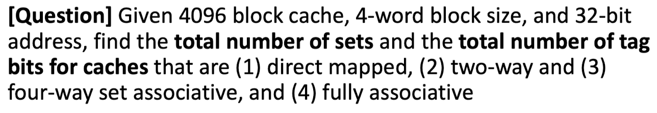 - total number of tag bits for caches = (32 - cache index bit - block offset bit - offset bit) * total number of sets = (32 - 12 - 2 - 2) * 4096 = 16 * 4096 = 2^4 * 2^12 = 2^16 = 66K tag bits