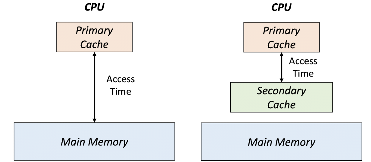 - primary cache -> second level cache 접근 시간 <<< main memory 접근 시간