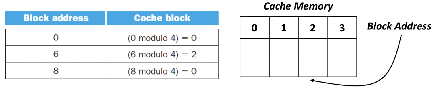 - cache memory의 block size = 4 -> modulo 4 연산으로 cache memory에 main memory의 block 매핑