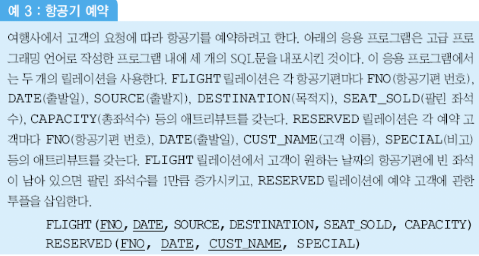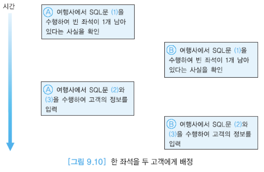 - SQL문 (1)의 수행 결과로 특정 항공기에 빈 좌석이 1개 남아 있다는 사실 확인 -> 동시에 SQL (2)와 (3)을 수행하여 팔린 좌석 수를 1씩 증가 -> 자신의 고객 정보를 항공사 DB에 입력 -> 이때 DBMS가 아무런 조치를 취하지 않으면 -> 1개 남은 좌석에 2명의 고객이 배정됨