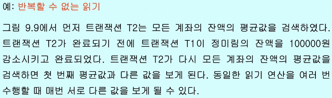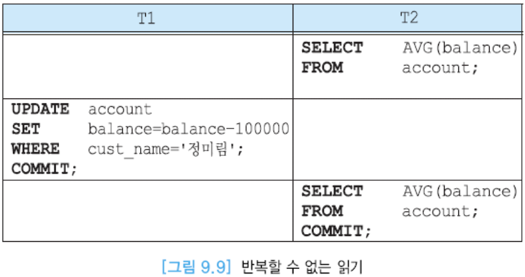 - 반복할 수 없는 읽기(unrepeatable read): 한 트랜잭션이 동일한 데이터를 두 번 읽을 때 -> 서로 다른 값