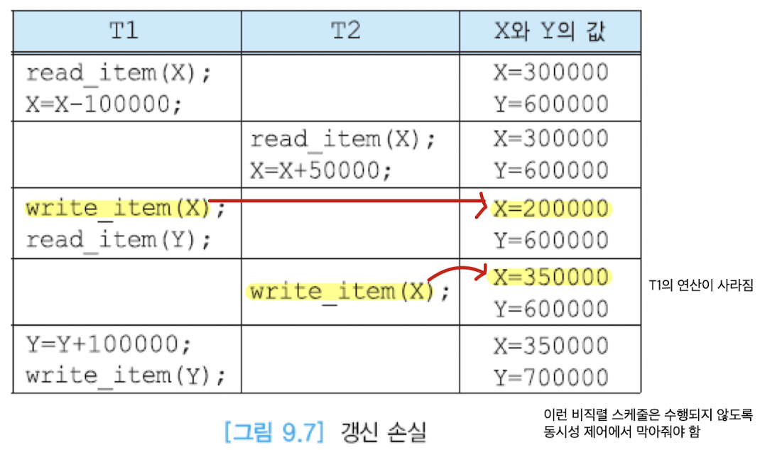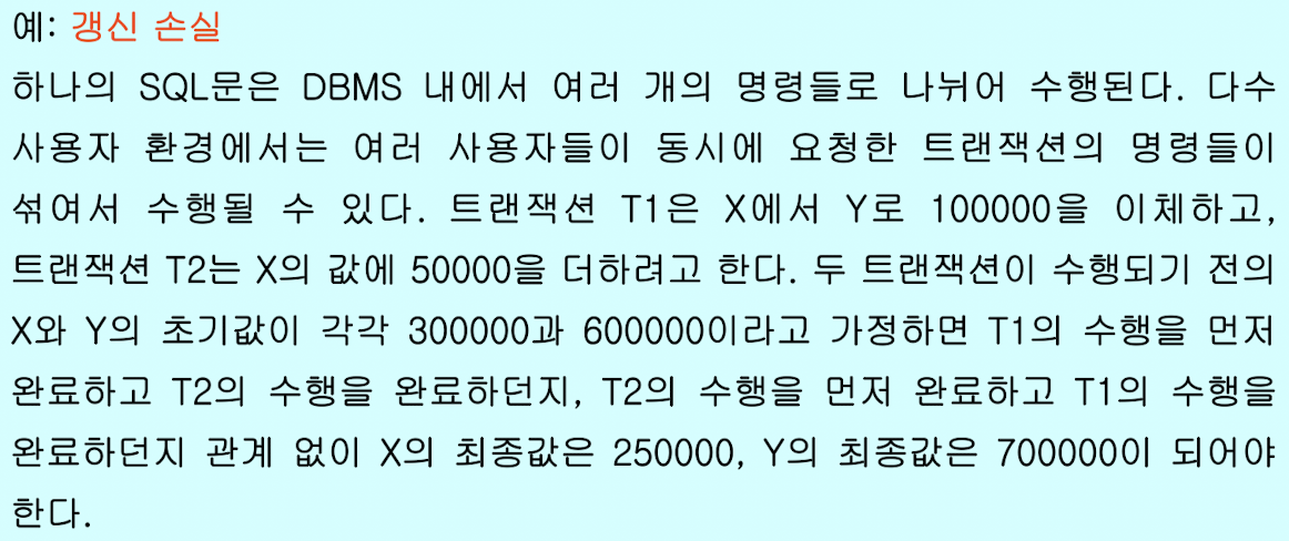 - 갱신 손실(lost update): 수행 중인 트랜잭션이 갱신한 내용을 다른 트랜잭션이 덮어씀-> 갱신 무효