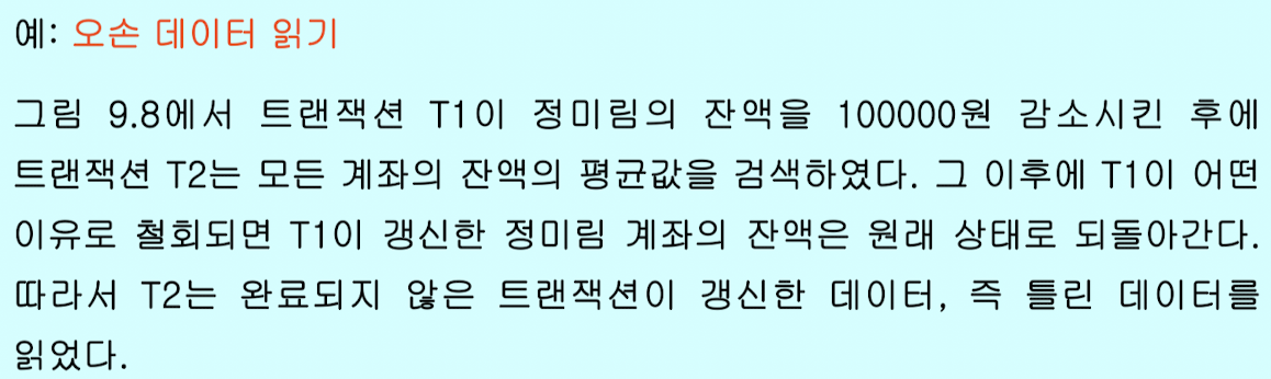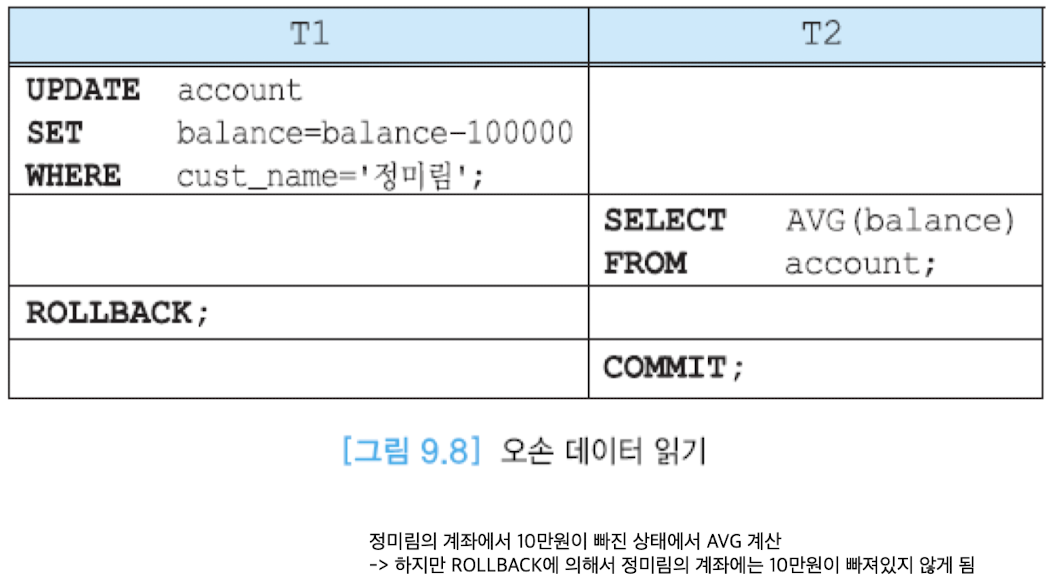 - 오손 데이터 읽기(dirty read): 완료되지 않은 트랜잭션이 갱신한 데이터를 읽는 것