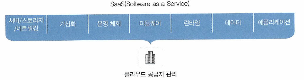 - Software as a Service: 소프트웨어 영역까지 클라우드 공급자가 관리 및 제공하는 유형